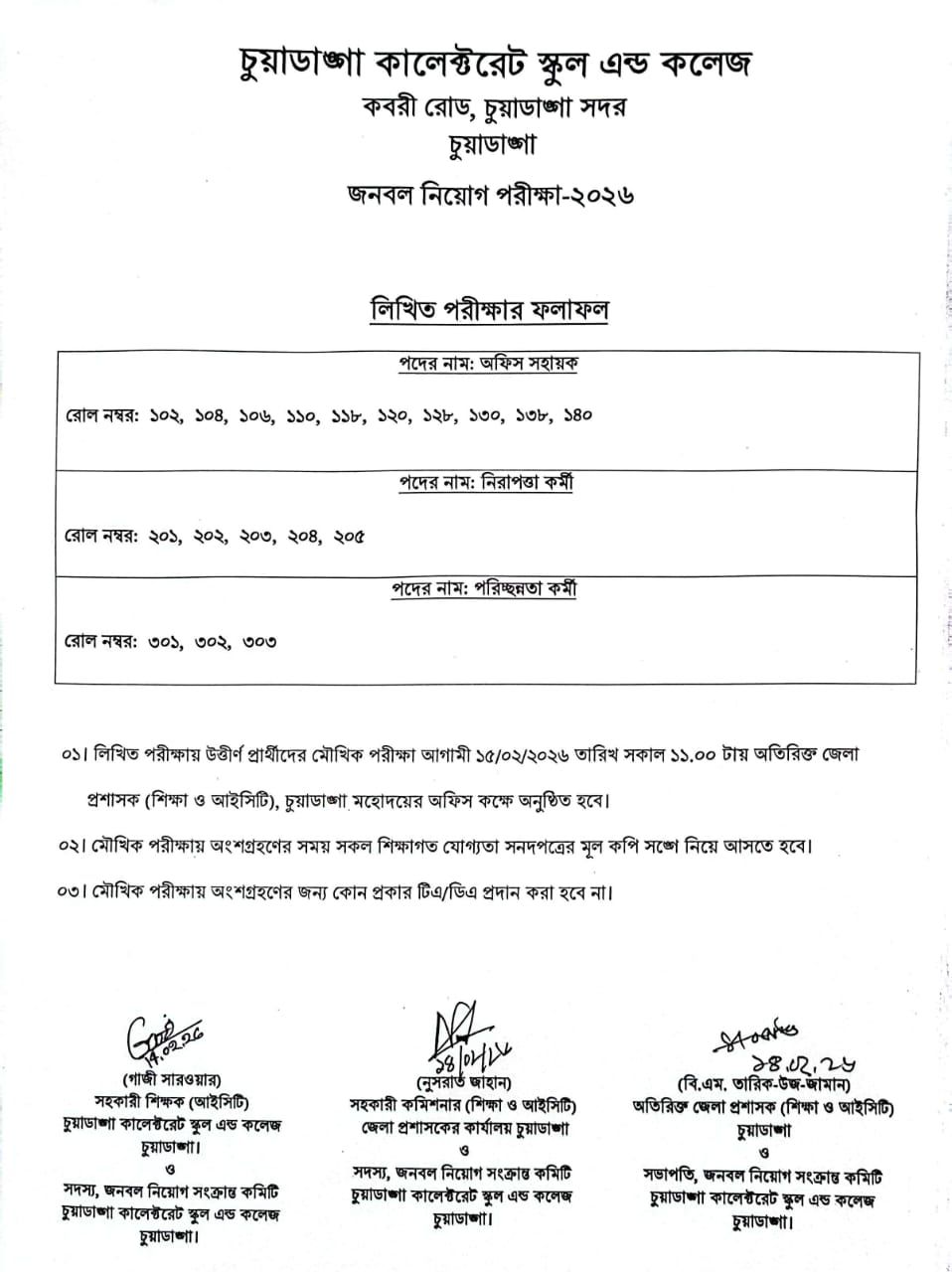 অফিস সহায়ক, নিরাপত্তা কর্মী ও পরিচ্ছন্নতা কর্মী পদে লিখিত পরীক্ষা ২০২৬ এর ফলাফল ও মৌখিক পরীক্ষায় অংশগ্রহণ সংক্রান্ত