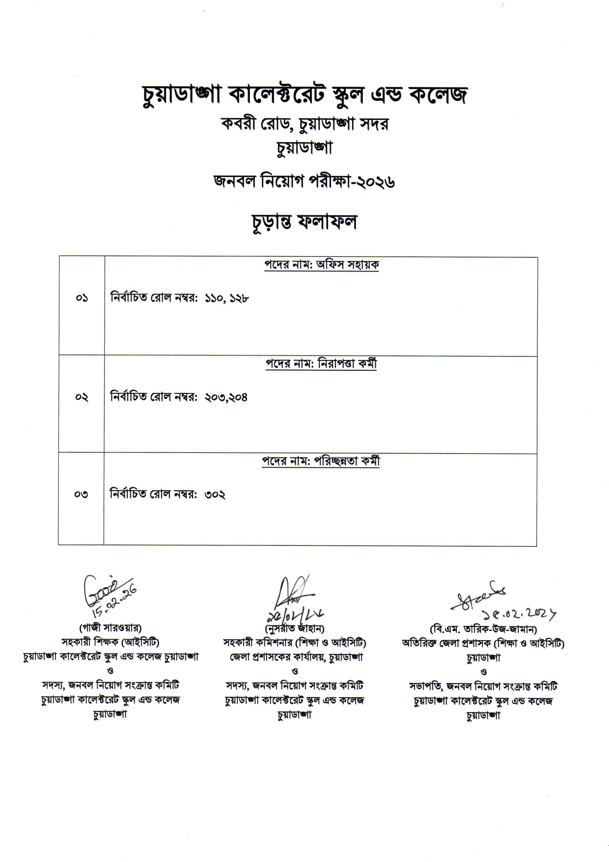 অফিস সহায়ক, নিরাপত্তা কর্মী ও পরিচ্ছন্নতা কর্মী পদে চূড়ান্তভাবে নির্বাচিত প্রার্থীদের রোল নম্বরসমূহ